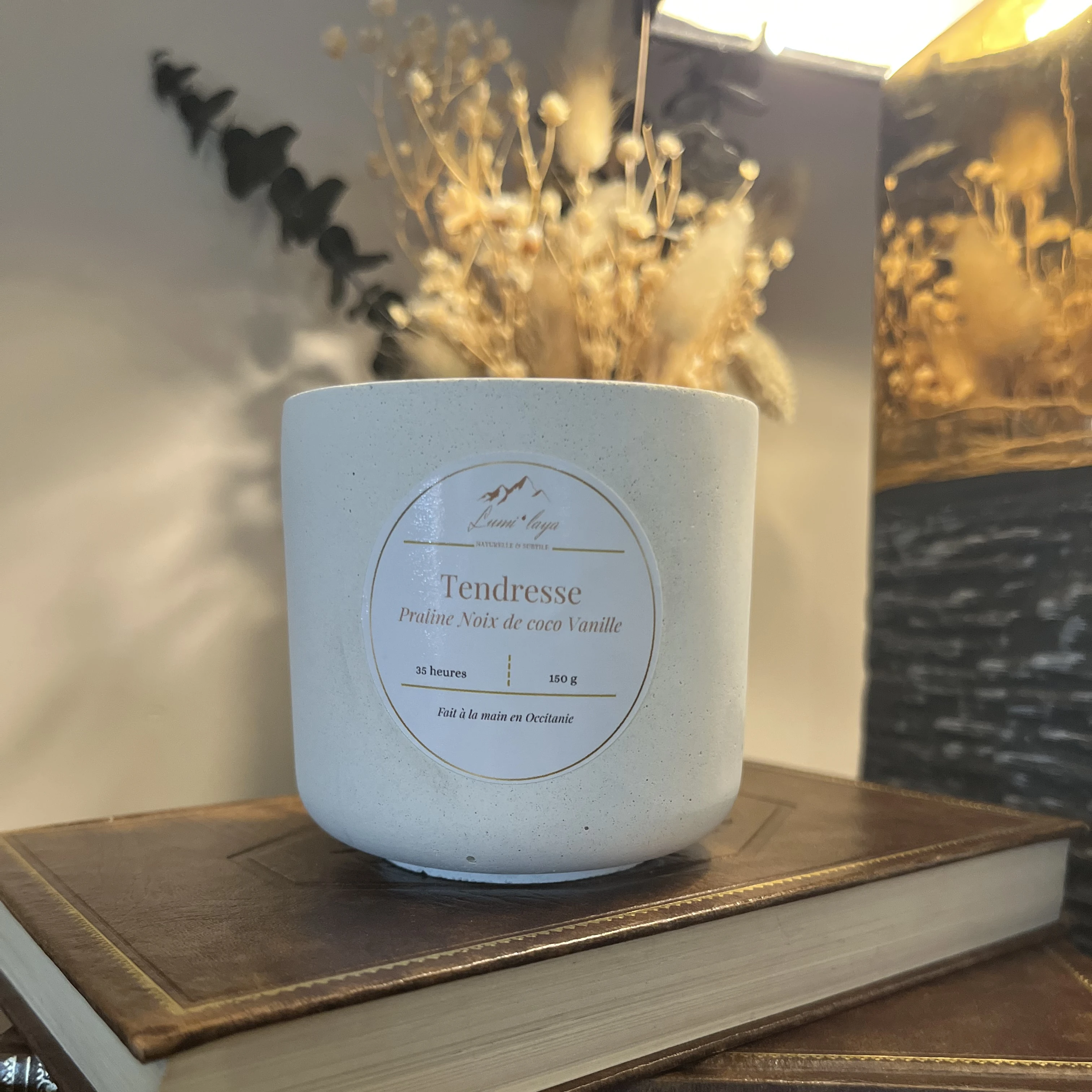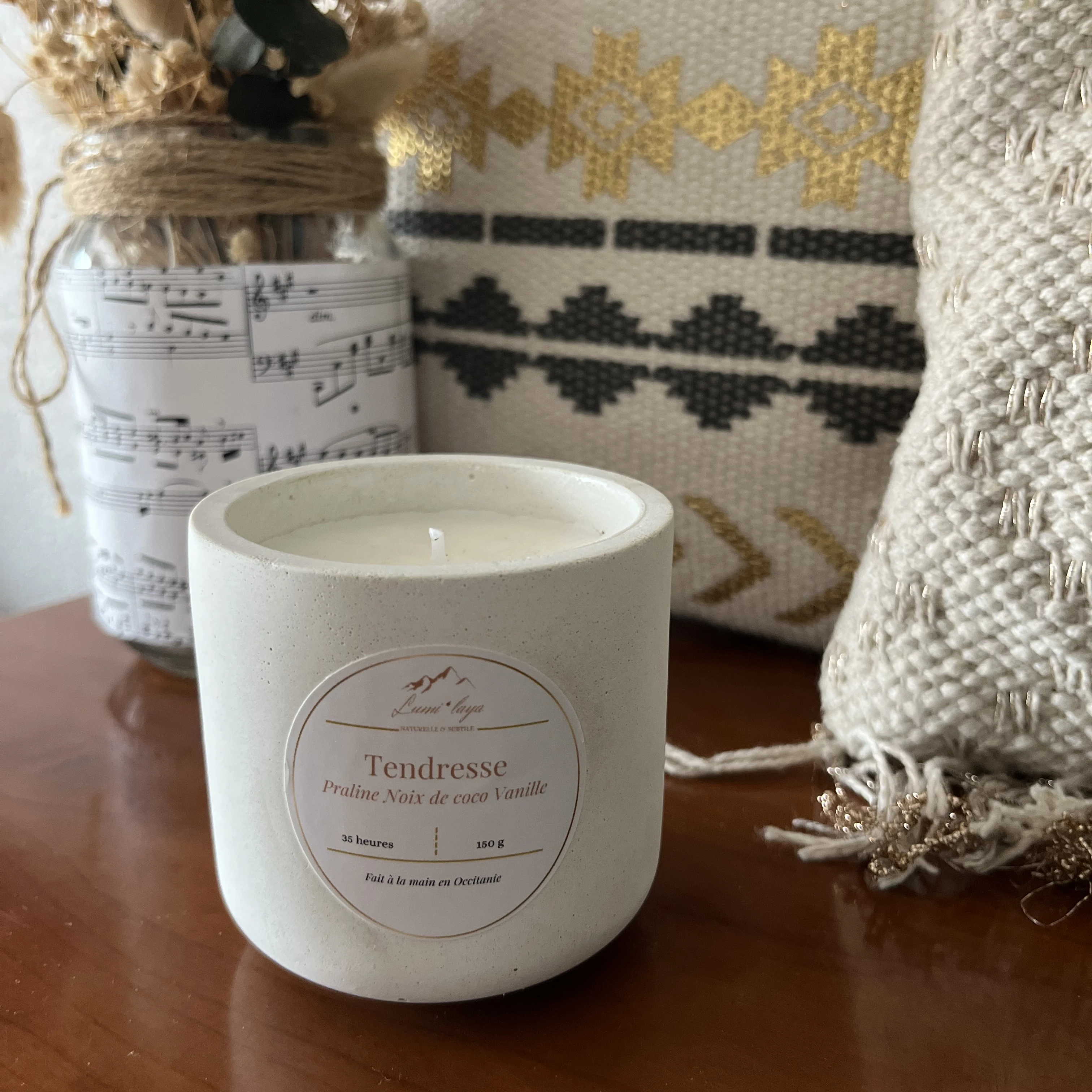 Dès les premières notes, la praline dévoile sa gourmandise délicate et légèrement caramélisée. La noix de coco apporte ensuite une touche douce et solaire, tandis que la vanille vient sublimer l’ensemble avec sa profondeur chaude et veloutée. L’accord de ces senteurs crée une atmosphère tendre et réconfortante, parfaite pour transformer votre intérieur en un véritable cocon de douceur. Allumer la bougie Tendresse, c’est s’offrir un moment de douceur absolue. La flamme éclaire délicatement la pièce pendant que le parfum gourmand se diffuse peu à peu, créant une ambiance chaleureuse et apaisante.