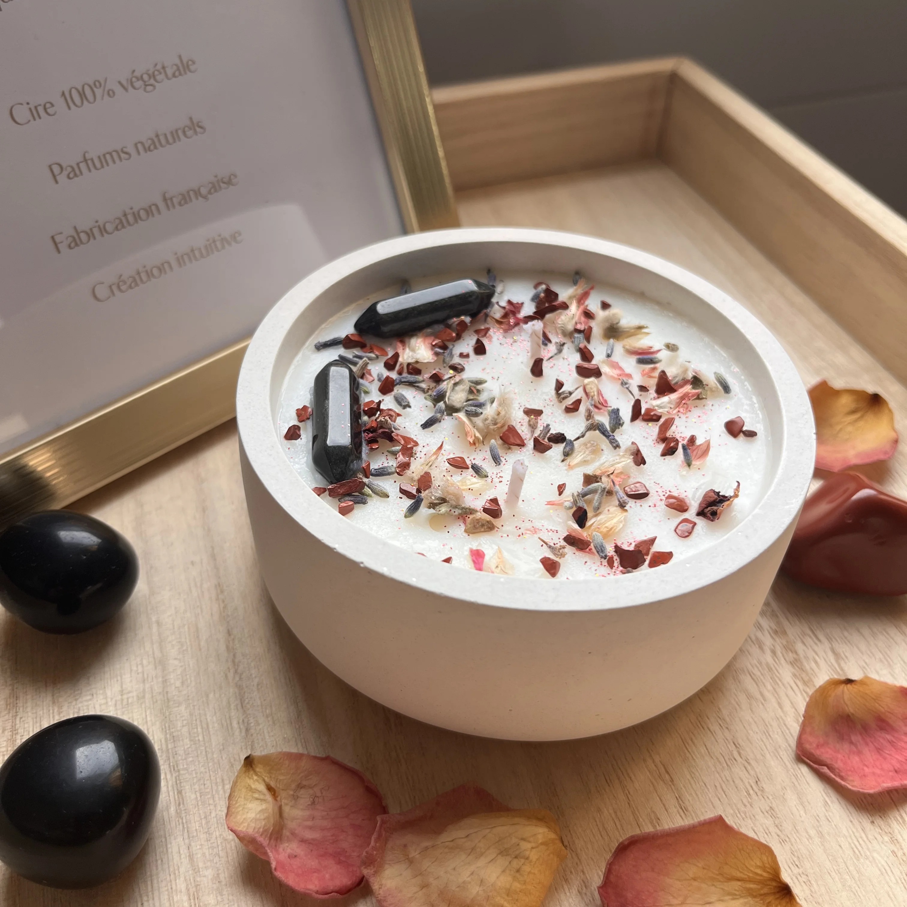Cire de soja et de coco 100% naturelles, mèche en coton bio et fragrances de Grasse certifiées. Aucun parfum synthétique, aucun additif.