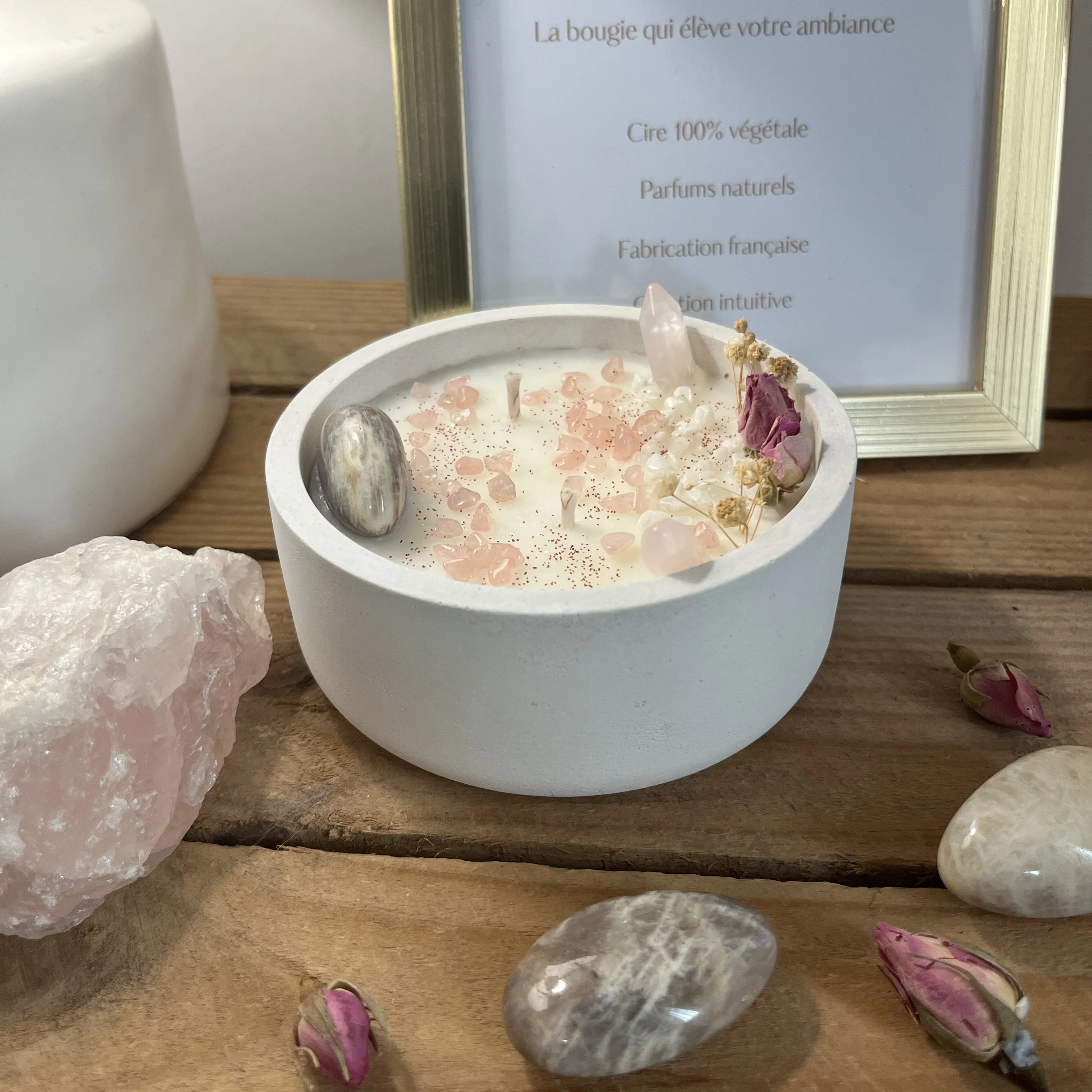 Cire de soja et de coco 100% naturelles, mèche en coton bio et fragrances de Grasse certifiées. Aucun parfum synthétique, aucun additif.